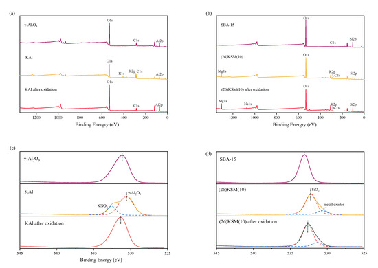 In order to verify the alkali adsorption and residue on the superbase materials, the X-ray photoelectron spectroscopy (XPS) analysis, before and after oxidation, was carried out. As shown in Figure 4a, potassium was loaded onto KAl successfully after baking, and nitrogen was also introduced, indicating that a partial potassium element might still exist in the form of KNO3, resulting in a slightly lower initial pH for the KAl/PS system than the (26)KSM(10)/PS system. After catalytic oxidation for 24 h, the potassium and nitrogen were both removed from the material, indicating that the alkaline had been eliminated. It can be seen in Figure 4b that KNO3 has completely decomposed into K2O in (26)KSM(10). After catalytic oxidation for 24 h, the potassium still existed at quite a low dose, and sodium from PS was adsorbed onto the material. Figure 4c,d describe the O1s binding energy of the two solid bases. Previous studies have shown that a lower O1s binding energy indicates a stronger electron donating ability, meaning a higher alkali strength [18]. The O1s binding energies of the KAl and (26)KSM(10) materials were lower than those of the parent material, which proved that alkali was loaded into the materials. The O1s spectra of KAl could be deconvoluted into two peaks at 530.7 eV and 532.5 eV. The peak at 530.7 eV corresponded to alkaline-enhanced γ-Al2O3, and that at 532.5 eV corresponded to KNO3. The characteristic peaks of O1s were fitted by two peaks in (26)KSM(10) at 530.6 eV and 532.2 eV, corresponding to metal oxides and alkaline-enhanced SiO2, respectively. The O1s spectra proved that the alkalinity of the two materials was weakened severely after 24 h of catalytic oxidation. KAl lost its alkalinity totally, while (26)KSM(10) lost most of its alkalinity; however, the alkalinity was still stronger than SBA-15, and a small amount of alkalinity remained on the solid’s surface.