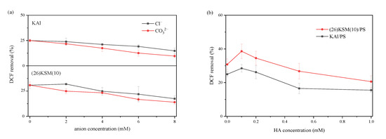 The influence of Cl−, CO32− and humic acid—which are prevalent in the environment—on DCF degradation was investigated. It can be seen in Figure 6a that the 4 h degradation ratio of DCF decreased continuously as the concentration of Cl− or CO32− increased in the range of 1–8 mM, and the inhibitory effect of CO32− was greater than that of Cl− in both the KAl/PS and (26)KSM(10)/PS systems. When the solution contained 8 mM Cl−, the degradation ratios of DCF were inhibited by 10.2% and 13.4%, respectively, in the KAl/PS and (26)KSM(10)/PS systems, and were inhibited by 15.3% and 16.8%, respectively, in the CO32− cases. The main reason for the inhibition of the reaction by anions was that Cl− and CO32− consumed •OH and •SO4−, as shown in Equations (1)–(4) [20,21].