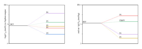 Acute toxicity of DCF and the main oxidation products. (a) 48 h Daphnia magna logLC50 (mol/L), (b) oral rat –lgLD50 (mol/kg).