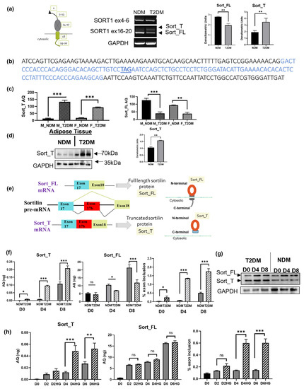 Next, we sought to elucidate the expression of sortilin splice variants during adipogenesis. The NDM and T2DM hASCs were differentiated and harvested as pre-adipocytes (D0), terminally differentiated adipocytes (D4), and mature adipocytes (D8). RNA was processed using real-time qPCR using primers specific for Sort_T and Sort_FL. The percent of Sort_T in total sortilin was calculated as percent exon inclusion for D0, D4 and D8 (Figure 1f). Western blot analysis was performed on whole-cell lysates and the results show high Sort_T expression levels during adipogenesis in T2DM compared to NDM (Figure 1g). These results demonstrate that Sort_T is significantly increased during adipogenesis in T2DM adipocytes.