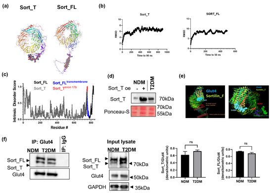 Molecular modeling and association of sortilin variants with Glut4. (a) De novo structure of sortilin splice variants was modeled using AlphaFold software. (b) Molecular dynamics (MD) was performed on the lowest energy structure for Sort_T and Sort_FL using Schrodinger software. RMSD was calculated, indicating stability over 100 ns MD minimization. (c) Intrinsic disorder was predicted using PONDR-Fit software (http://original.disprot.org/pondr-fit.php) using sequences for each sortilin variant. Scores over 0.5 are predicted to be intrinsically disordered. (d) NDM adipocytes were transfected with Sort_T for 48 h. Conditioned media was collected from NDM, T2DM, or NDM over-expressing Sort_T, methanol extracted and analyzed via Western blot using the Sort_T specific antibody. Ponceau-S staining was used to visualize equal loading of lysates in the lanes. (e) Using the protein folding server I-TASSER (https://zhanggroup.org/I-TASSER/) and Schrodinger, models of Sort_FL, Sort_T and Glut4 were generated and equilibrated. Visualization and analysis were carried out using VMD 1.9.3. Characterization of protein–protein interactions between sortilin variants and Glut4 was carried out using ClusPro. Sort_FL was embedded into the membrane at TM domain (Shown as brown bars). Glut4 binding region (G4BR) is shown in blue. Arg (R292, in red) is on end of exon 17 and serves as an orientation point. The additional amino acids on Sort_T are shown in green. (f) Coimmunoprecipitation assay was performed by using Glut4 antibody for immunoprecipitation. Western blot analysis was then performed on the immunoprecipitated (IP) samples using antibodies against sortilin (against the N-terminal domain recognizing both variants) or Glut4 as indicated in the figure. Graphs show densitometric analysis of individual sortilin bands normalized to Glut4 (n = 3). Simultaneously, the input lysate was analyzed via Western blot using antibodies against sortilin or Glut4 (n = 3). Statistical analysis was performed via two-tailed t-test, ns = not significant.