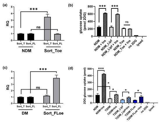 Human nondiabetic and diabetic pre-adipocytes were grown to confluency in a 96-well plate and differentiated for 2 days in differentiation media; 1μg plasmid per 1 mL of media for Sort_T, Sort_FL or lipofectamine control was overexpressed for 48 h in differentiation media. Glucose uptake was performed (ProMega #TM467, Madison, WI, USA) by measuring luciferase luminescence. Briefly, cells were serum-starved in Krebs-Ringer Phosphate HEPES buffer (KRPH) for an hour before insulin treatment (100 nM, 10 min). Cells were washed and treated with 1 mM of 2-deoxyglucose 6-phosphate (2DG6P) for 10 min. Cells were washed again in KRPH buffer and lysed. A standard curve was generated, and luminescence was measured on a Biotek Synergy Mx microplate reader (Agilent Technologies, Santa Clara, CA, USA) using a 1 s integration time and 2DG6P quantification of samples were calculated.