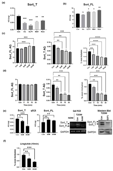 GLP1 has a short half-life of two minutes and GLP1R agonists have been developed with modifications to increase stability of the peptide. Liraglutide has a 97% sequence homology to GLP1 and has an inclusion of a fatty acid chain and a Lys34Arg substitution, which increases the half-life to 13 h in vivo [36,37,38]. Hence, we evaluated liraglutide’s effects on sortilin’s pre-mRNA alternative splicing. The T2DM adipocytes were treated with 8 nM or 30 nM liraglutide for 10 min. The results (Figure 4f) show a dramatic reduction of Sort_T with a concurrent increase in Sort_FL.