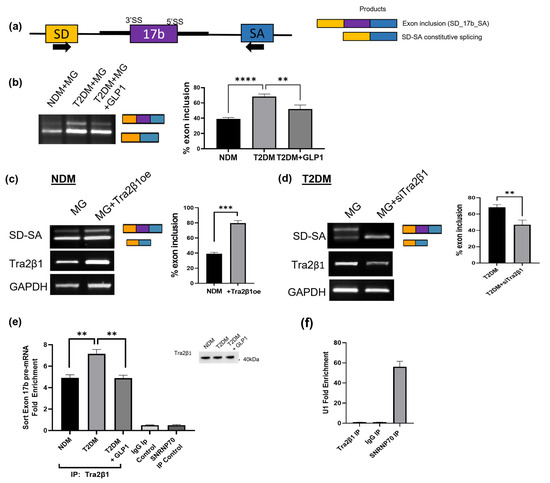 To determine the role of Tra2β1 on sortilin exon 17b inclusion, NDM adipocytes were transfected with Tra2β1 plasmid for 48 h, followed by MG transfection for 24 h. PCR was performed using SD and SA primers. The results show an increase in exon 17b inclusion in the MG splicing with Tra2β1 overexpression compared to the lipofectamine control (Figure 6c).