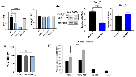 Morpholinos are antisense oligonucleotides with a modified morpholine backbone, resulting in the ability to influence splicing events without degradation of the pre-mRNA transcript. Morpholino ASOs were designed spanning the Tra2β1 consensus sequence within exon 17b, such that the ASO inhibits Tra2β1 binding to sortilin pre-mRNA. The optimal 25-mer ASO (ASO1152) was blasted using an NCBI Nucleotide Blast to confirm uniqueness and minimize off target effects within the human genome. T2DM adipocytes were treated with 1 μM or 10 μM ASO1152, or 10 μM of a nonspecific control ASO (ASONS), or Endo-Porter transfection control (EP) for 48 h. The results (Figure 7a) show reduced Sort_T expression with no change in Sort_FL expression levels with ASO. Western blot analysis (Figure 7b) showed decrease in Sort_T protein levels. Apoptosis assay (Figure 7c) demonstrated no toxicity with ASO1152. Next, T2DM adipocytes were treated with ASO1152, and glucose uptake assay was performed. The results (Figure 7d) show improved insulin-stimulated glucose uptake with the morpholino ASO1152 treatment.