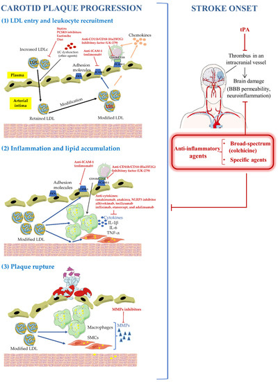 A first line of anti-inflammatory therapy is the long-term use of broad-spectrum agents, mainly low doses of colchicine or methotrexate. However, these agents usually have undesirable side effects, such as the renal toxicity ascribed to colchicine. On the other hand, studies based on inhibiting specific cytokines have shown promising but inconclusive results. Inflammatory cytokines can be blocked by different approaches, such as the use of soluble receptors and MAb against specific inflammatory mediators, such as IL-1β and IL-6. CANTOS trial reported the beneficial effect on CV risk of blocking IL-1β [118]. Unfortunately, trials assessing anti-inflammatory agents have used composite endpoints of CV risk and not specifically stroke caused by carotid atherosclerosis. Other trials evaluating agents that inhibit TNF-α, CAMs, leukotrienes, secretory phospholipases, and inflammation-associated antioxidants have been ineffective for event reduction [119]. Novel anti-inflammatory and anti-cytokine agents targeting molecules upstream of IL-1β, such as NLR family pyrin domain-containing 3 (NLRP3) inhibition and other pathways of innate immunity, have also been proposed [120]. Clinical trials to date involving anti-inflammatory therapies that include stroke among clinical outcomes are summarized in Table 1.