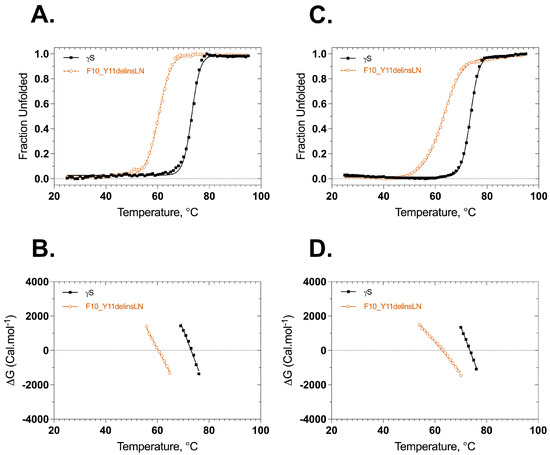 ΔG values were calculated from the ellipticities at 218 nm or fluorescence ratio (350 nm/330 nm) at various temperatures using the equation ΔG° = −RTlnK, where R is the gas constant 1.987 kcal K−1 mol−1, and is plotted against the temperatures as shown in Figure 3B,D. The ΔG plots derived from the ellipticities are almost parallel to each other, with the F10_Y11delinsLN mutant ΔG plot crossing 0 at 60.4 °C and that for the wild type crossing 0 at approximately 73.1 °C (Figure 3B, Table 1). In contrast, the ΔG plots derived from the fluorescence ratio show a greater difference in slope, corresponding to the more gradual upslope of the fluorescence ratio of the mutant, with the F10_Y11delinsLN mutant ΔG plot crossing 0 at 62.8 °C and that for the wild type crossing 0 at approximately 73.5 °C (Figure 3D, Table 1). There is no discernable break in the ΔG plot for the F10_Y11delinsLN mutant, as would be expected for a three-state denaturation process. The ΔH values calculated from these plots for the wild type are 137.3 and 137.4 kcal mol−1 and for the mutant are 95.2 and 59.6 kcal mol−1 from CD and fluorescence-based unfolding methods, respectively. The Van’t hoff plots also followed similar trends, although there was a slight indication of a three-step denaturation process for the F10_Y11delinsLN mutant (Figure S3B,C). Overall, thermal denaturation as assessed using both the CD and tryptophan fluorescence emission methods confirms that the mutant is structurally less stable than the wild-type crystallin.