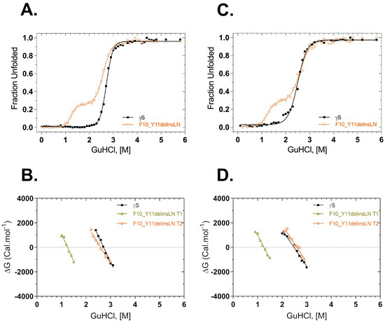 Thermodynamic stability was also assessed under GuHCl chemical-induced stress. Fluorescence intensity at 355/330 nm was used to monitor structural changes in the native environment and under increasing concentrations of GuHCl (Figure 4A). The GuHCl unfolding profile of the F10_Y11delinsLN mutant differs from that of the wild type, exhibiting a three-state transition with a clear destabilized N-terminal intermediate populated around 1.25 M GuHCl. In contrast, the wild type shows a sharp two-state transition. The C-terminal domain transitions of the wild type and F10_Y11delinsLN mutant are similar, occurring at around 2.72 and 2.59 M GuHCl, respectively. ΔG values are shown as a function of GuHCl in Figure 4B. ΔG plots for the second transition were similar in both the proteins, but the mutant shows an additional ΔG value from the transition at 1.25 M. ΔG values calculated for the first and second transition of the mutant are 5.6 kcal mol−1 and 8.4 kcal mol−1, respectively, while for the wild type transition it is 11.7 kcal mol−1. The refolding curves and their derived ΔG plots show similar trends (Figure 4C,D) in that the curve for the mutant shows two clear transitions at 1.26 M and 2.60 M, while the curve for wild-type γS-crystallin exhibits only a single transition at around 2.48 M, although there is some scatter at the beginning of the transition (Figure 4C). Some small differences were seen between the unfolding and refolding parameters of the wild type and mutant (Table 2).