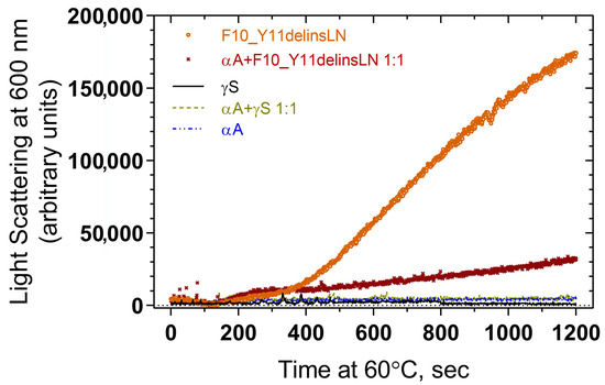 Association of αA-crystallin with wild-type and mutant F10_Y11delinsLN γS-crystallin under benign and thermal stress conditions were tested by heating the protein samples at 60 °C and checking for light scattering by particles at 600 nm. Wild-type γS- and αA-crystallins show little light scattering over the entire 1200 s exposure, while the mutant alone shows increasing levels of light scattering particles beginning at 400 s (Figure 5). A 1:1 molar ratio mixture of αA-crystallin and F10_Y11delinsLN mutant γS-crystallin displays significantly less light scattering and a slower increase in light scattering compared to the F10_Y11delinsLN mutant γS-crystallin alone, indicating that αA-crystallin is associating with the mutant as it begins to denature under thermal stress and preventing it from forming HMW aggregates or other light scattering particles.