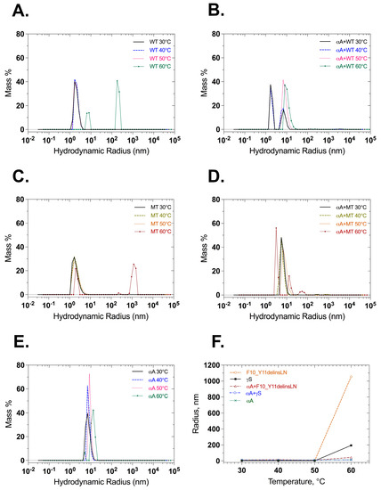 Particle size and distribution measured at different temperatures by dynamic light scattering. (A) Wild-type γS-crystallin, (B), αA-crystallin + wild-type γS-crystallin 1:1 molar ratio, (C) F10_Y11delinsLN mutant γS-crystallin, (D) αA-crystallin + F10_Y11delinsLN mutant γS-crystallin 1:1 molar ratio. (E) αA-crystallin and (F) hydrodynamic radii shown as a function of temperatures: 30, 40, 50, and 60 °C. WT: wild-type γS-crystallin, MT: F10_Y11delinsLN Mutant γS-Crystallin, αA: αA-Crystallin.
