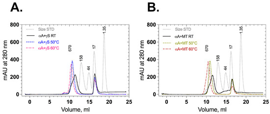 Association of αA-crystallin with wild-type and mutant γS-crystallin in their native and stressed states was also checked by analytical size exclusion chromatography. Mixed wild-type γS-crystallin and αA-crystallin displayed two elution peaks around 9–13 mL (500 kDa) and 16–18 mL (20 kDa) (Figure 7A), as did mixed F10_Y11delinsLN γS-crystallin and αA-crystallin (Figure 7B). No additional peaks corresponding to higher aggregates were observed. When the proteins (αA-crystallin + wild type or αA-crystallin + mutant F10_Y11delinsLN) were stressed and loaded onto size exclusion chromatography columns, the peak around 9–13 mL (500 kDa) was sharp and shifted slightly to its left. Mass spectrometry analysis was performed to identify the proteins in each peak (Table S1). In room-temperature-incubated (native) samples (αA-crystallin + wild type or αA-crystallin + mutant F10_Y11delinsLN), the peak at around 9–13 mL contains pure αA-crystallin and the peak at around 15–18 mL displayed either wild-type or mutant γS-crystallin (Supplementary Table S1A,B). In αA-crystallin + wild-type γS-crystallin samples stressed at 50 °C, the peak at around 9–13 mL had a mass similar to that of αA-crystallin (20,729.7 ± 1 Da, Table S1C). However, in the αA-crystallin + mutant F10_Y11delinsLN samples stressed at 50 °C, the peak at around 9–13 mL had a mass similar to that of αA-crystallin peak (20,729.7 ± 1 Da) along with F10_Y11delinsLN mutant γS-crystallin around 9.5 mL (Table S1D). In the αA-crystallin + wild-type sample stressed at 60 °C, the peak at around 9–13 mL still showed a mass consistent with that of αA-crystallin (20,729.7 ± 1 Da, Supplementary Table S1E), but the αA-crystallin + mutant F10_Y11delinsLN sample showed αA-crystallin and mutant F10_Y11delinsLN γS-crystallin in both the 9.5 and 10.5 mL fractions (Table S1F), indicating that the mutant alone is associating with αA-crystallin under thermal stress at 50 °C and 60 °C. In all cases, the fractions around 15–18 mL displayed either wild-type (20,870.4 ± 2 Da) (Table S1A,C,E) or mutant mass (20,787.5 ± 1 Da) (Table S1B,D,F), depending on the samples loaded. Close inspection of SEC shows that the 15–18 mL peak height of wild-type γS-crystallin is almost the same for all temperatures, but it is decreased to half of its height in the F10_Y11delinsLN mutant γS-crystallin sample stressed at 60 °C compared to the room-temperature sample, consistent with the appearance of the F10_Y11delinsLN mutant γS-crystallin in the exclusion peak. Thus, the F10_Y11delinsLN mutant but not wild-type γS-crystallin is bound by αA-crystallin under stressed (50 °C and 60 °C) conditions, consistent with the DLS results.