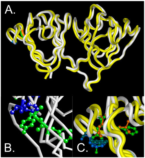 The crystal structure of wild-type human γS-crystallin was taken from 7N36 in the RCSB PDB (https://www.rcsb.org, accessed on 30 May 2023) [35]. The modeling of the F10_Y11delinsLN mutantγS-crystallin protein was carried out using the Expasy Swiss-Model Workspace with the fully automated option using the 7N36.1.A structure as a template and default parameters (SWISS-MODEL Workspace—SIB Swiss Institute of Bioinformatics|Expasy). This provided 99% coverage (amino acids 5–178), 98.87% sequence identity and a GMQE of 0.88. The wild-type and mutant protein structures were overlaid using the Protein Analysis and Modeling module of DNASTAR version 17.1.1.120. Backbones structures and distances were viewed using the molecular graphics program RasMol version 2.7.4.2.