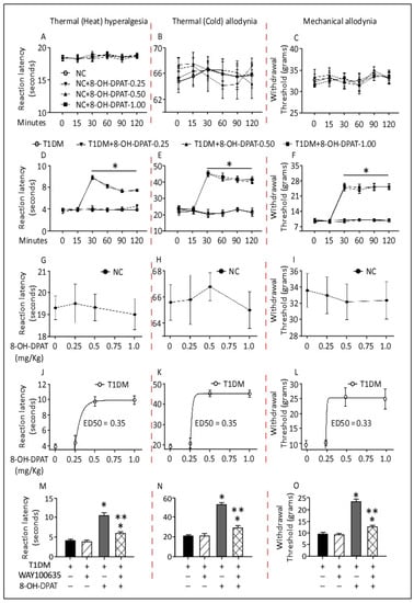 Time- and dose-response curves of administered 8-OH-DPAT in NC and T1DM rats. 8-hydroxy-2-(dipropylamino)tetralin showed no effect in naïve (A–C) rats but elevated nociceptive threshold dose-dependently in diabetic (D–F) rats. 8-hydroxy-2-(dipropylamino)tetralin elevated nociceptive threshold in diabetic in a dose-dependent manner (J–L) but not in control (G–I) rats at 30 min time-point post-administration. WAY100635 antagonizes 8-OH-DPAT’s antinociceptive effects (M–O). Each bar represents means ± SEM of values obtained from five animals/group. * 8-OH-DPAT-treated diabetic animals were significantly different from corresponding diabetic animals at p ≤ 0.05. ** Drug-treated diabetic animals were significantly different from corresponding 8-OH-DPAT-treated animals alone at p ≤ 0.05. Two-way ANOVA was followed by Bonferroni’s post-test, and one-way ANOVA followed by Dunnett’s post-test. Abbreviations: NC—normal control, T1DM—type 1 diabetes mellitus and 8-OH-DPAT—8-hydroxy-2-(dipropylamino)tetralin.