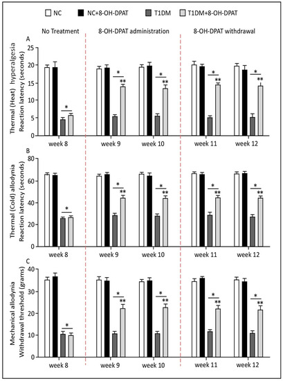 Persistent 8-OH-DPAT antinociceptive effects following two weeks of withdrawal. 8-hydroxy-2-(dipropylamino)tetralin (0.5 mg/kg) was injected i.p. on a daily basis for 14 days. Changes in nociceptive behavior to (A) thermal (heat), (B) thermal (cold), and (C) mechanical stimuli were assessed every week for 14 days in the presence and absence of 8-OH-DPAT. Each bar represents the means ± SEM of values obtained from five animals/group. * Diabetic animals were significantly different from corresponding control animals at p ≤ 0.05. ** 8-OH-DPAT-treated diabetic animals were significantly different from corresponding diabetic animals at p ≤ 0.05. Two-way ANOVA followed by Bonferroni’s post-test. Abbreviations: NC—normal control, T1DM—type 1 diabetes mellitus and 8-OH-DPAT—8-hydroxy-2-(dipropylamino)tetralin.