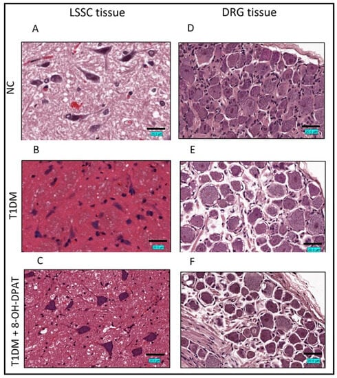 Chronically administered 8-OH-DPAT halts T1DM-induced neuronal degeneration. 8-hydroxy-2-(dipropylamino)tetralin (0.5 mg/kg) was administered i.p. on a daily basis for 14 days. Hematoxylin and Eosin staining of LSSC (A–C) and DRG (D–F), respectively (magnification: 40× and scale bar: 20 µm). Abbreviations: NC—normal control, T1DM—type 1 diabetes mellitus, LSSC—lumbar segment of the spinal cord, DRG—dorsal root ganglia and 8-OH-DPAT—8-hydroxy-2-(dipropylamino)tetralin.