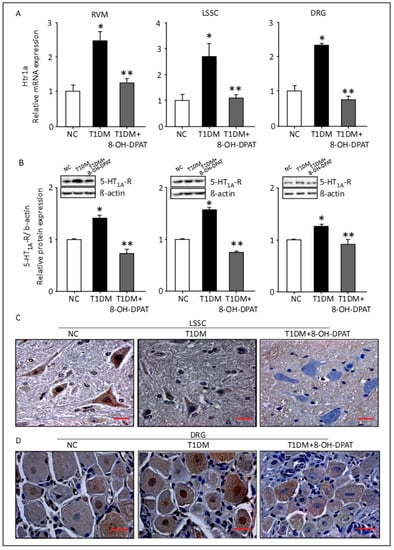 We further evaluated 5-HT1AR protein levels using an immunohistochemical staining technique. Immunoreactivity of 5-HT1AR proteins was more intense in LSSC cells of T1DM tissue sections than those of control tissue sections, whilst staining was decreased following treatment with 8-OH-DPAT (Figure 4C). A similar trend of 5-HT1AR protein immunostaining was also observed in the DRG tissue sections.