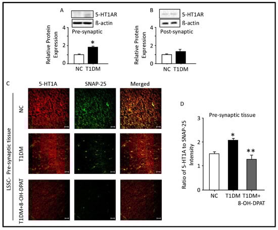 We recently showed that SNAP-25 is a biochemical marker for presynaptic LSSC tissues, while PSD-95 is for postsynaptic LSSC tissues [27]. Double-immunofluorescent staining with 5-HT1AR and SNAP-25 (Figure 5C) specific antibodies demonstrated expression and co-localization of these proteins in the LSSC presynaptic tissues. Quantitation of 5-HT1AR/SNAP-25 protein expression revealed a significant elevation STZ-induced T1DM (Figure 5C, p = 0.0491, t = 4.35). Chronic i.p. administration of 8-OH-DPAT (0.5 mg/kg) for a period of two weeks alleviated upregulation of presynaptic 5-HT1AR in LSSC (Figure 5D, F: 9.11, p = 0.0152) of STZ-induced T1DM.