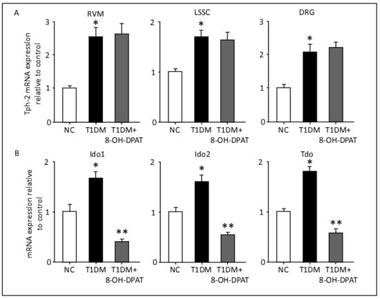 Chronically administered 8-OH-DPAT reverses T1DM-induced upregulation of Ido1, Ido2 and Tdo but not Tph-2, in the spinal cord lumbar region. Expression of Tph-2 (A), Ido1, Ido2 and Tdo (B) were quantified at mRNA levels using qRT-PCR. 8-hydroxy-2-(dipropylamino)tetralin (0.5 mg/kg) was injected i.p. daily for 14 days. Each bar represents the mean ± SEM of values obtained from five animals/group. * Diabetic animals were significantly different from corresponding control values at p ≤ 0.05. ** 8-OH-DPAT-treated diabetic animals were significantly different from corresponding diabetic animals at p ≤ 0.05. One-way ANOVA followed by Dunnett’s post-test. Abbreviations: NC—normal control, T1DM—type 1 diabetes mellitus, RVM—rostral ventromedial medulla, LSSC—lumbar segment of the spinal cord, DRG—dorsal root ganglia, Tph-2—tryptophan hydroxylase-2, IDO—indoleamine 2,3-dioxygenase, TDO—tryptophan 2,3-dioxygenase and 8-OH-DPAT—8-hydroxy-2-(dipropylamino)tetralin.
