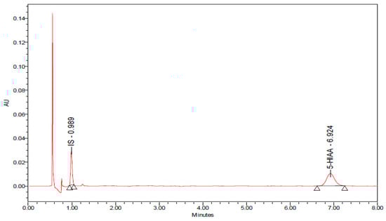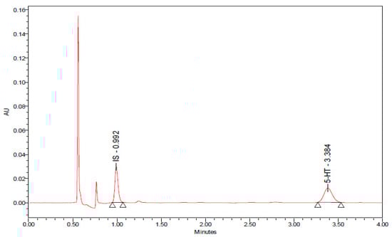 Chromatographs of a standard solution of 5-HT, 5-HIAA and QA. Abbreviations: 5-HT—5-hydroxytryptamine or serotonin, 5-HIAA—5-hydroxyindole acetic acid, QA—quinolinic acid, IS—internal standard and AU—arbitrary units.