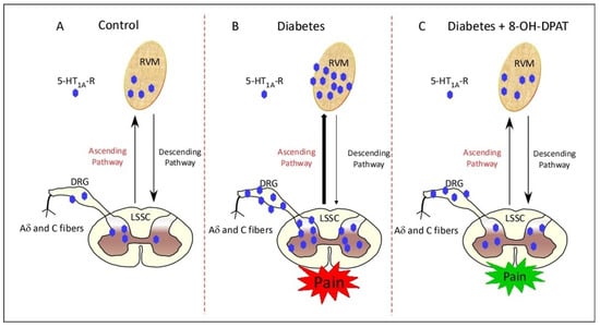 Schematic representation of presynaptic 5-HT1AR in STZ-induced T1DM, neuropathic pain and 8-OH-DPAT administration. When compared to the control status (A), diabetes enhances neuronal presynaptic expression of 5-HT1AR in the RVM, LSSC and DRG (B). 8-OH-DPAT administered chronically for 14 days reversed increased neuronal expression of presynaptic 5-HT1AR in this disease state (C). The upward arrow indicates the ascending pain transmission pathway, while the downward arrow indicates the descending pain transmission pathway. Pain in the red bubble indicates pain aggravation, and pain in the green bubble indicates pain alleviation. The thick and thin arrows in (B) represent hyperactive ascending pathways and hypoactive descending pathways. Abbreviations: 8-OH-DPAT—8-hydroxy-2-(dipropylamino)tetralin, 5-HT1AR—5-HT1A receptors, RVM—rostral ventromedial medulla, LSSC—lumbar segment of the spinal cord and DRG—dorsal root ganglia.