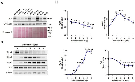FLII expressional patterns in mouse tissues and during C2C12 differentiation. (A) Relative expression levels of FLII in C2C12 myoblasts and various tissues of C57BL/6 mice were analyzed via immunoblotting using α-Tubulin as the loading control. (B) C2C12 myoblasts were differentiated for 8 days, and the expressions of MyHC, MyoD, MyoG, and FLII were assessed via immunoblotting. (C) Protein levels in (B) were quantified via densitometry and normalized versus β-actin. Results are presented as relative ratios where degrees of differentiation on day 0 (MyoD and FLII), day 1 (MyoG), or day 2 (MyHC) were set to one. Results are presented as means ± SEMs (n > 3), and statistical significances are represented by *, p < 0.05; **, p < 0.01; ***, p < 0.001 vs. differentiation day 0.