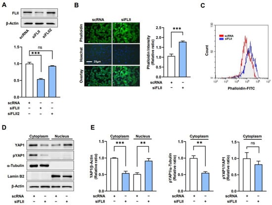 FLII knockdown induced the accumulation of F-actin and nuclear YAP1. C2C12 cells were transfected with 200 nM FLII siRNA (siFLII or siFLII2) or control (scRNA) for 24 h. (A) FLII protein levels were determined via immunoblotting. (B) Immunostaining was performed using F-actin (FITC-Phalloidin, green) and Hoechst 33342 (blue, a nuclear stain). Scale bar: 25 μm. Phalloidin intensities were quantified using ImageJ software 1.54f. (C) Determination of F-actin contents in FITC-phalloidin stained cells via flow cytometry. (D,E) YAP1 and phosphor-YAP1 (pYAP1) immunoblots were analyzed in the cytoplasmic and nuclear fractions. α-Tubulin and Lamin B were used as cytoplasmic and nuclear fraction markers, respectively. Results are relative ratios versus Lamin B or α-Tubulin and are presented as means ± SEMs (n > 3). Statistical significances are represented by **, p < 0.01 or ***, p < 0.001 vs. scRNA controls. ns: no significance.