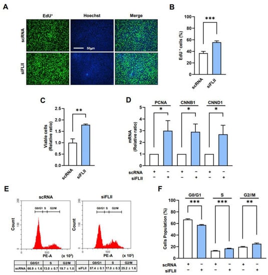 Given that the nuclear translocation of YAP1 promotes cell cycle progression and proliferation [,], we next investigated whether FLII knockdown stimulates cell cycle progression and proliferation in C2C12 myoblasts. After transfecting the myoblasts with siFLII or scRNA control for 24 h, an EdU incorporation assay and viable cell analysis were conducted to measure cell proliferation. FLII knockdown using siFLII substantially elevated the proportion of EdU-positive cells (Figure 3A,B) and viable cells (Figure 3C) by ~1.6-fold and ~1.7-fold, respectively, when compared with scRNA controls, demonstrating that FLII depletion promoted myoblast proliferation. The enhanced cell proliferation by FLII knockdown was rescued to the scRNA control levels by Y-27632 treatment (Supplementary Figure S1C). In addition, we determined the transcript levels of PCNA, CCNB1, and CCND1, which are known to induce cell cycle progression and proliferation [], to verify the effect of siFLII on cell proliferation. In line with our results from the EdU incorporation and viable cell analysis, the mRNA of PCNA, CCNB1, and CCND1 were dramatically increased by FLII knockdown versus scRNA controls (Figure 3D). Next, we analyzed the cell cycle to determine whether depletion of FLII promotes cell cycle progression. Flow cytometry analysis revealed that siFLII transfections elevated the proportions of cells in the S and G2/M phases and decreased the proportion of cells in the G0/G1 phase (Figure 3E,F), indicating that FLII knockdown facilitates cell cycle progression. Collectively, these observations indicate that FLII depletion facilitates cell cycle progression and myoblast proliferation.