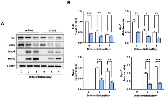 FLII knockdown inhibited the expressions of myogenic regulatory factors. C2C12 cells were transfected with FLII siRNA (siFLII, blue column) or control (scRNA, white column) and cultured in a differentiation medium for three or five days. (A) Representative immunoblots of FLII, MyoD, and MyoG proteins. (B) Quantification of protein levels in (A) normalized versus β-actin. Results are presented as means ± SEMs (n > 3). Statistical significances are represented by *, p < 0.05; **, p < 0.01; ***, p < 0.001 vs. scRNA controls. ns: no significance.