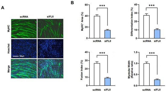 Next, myoblasts transfected with scRNA or siFLII were allowed to differentiate for five days in DM, and differentiation and myotube formation were assessed via immunocytochemistry using MyHC antibody and image analysis. FLII knockdown was found to impede differentiation and myotube formation dramatically, as determined using immunocytochemistry, areas of MyHC-positive cells, indices for differentiation and fusion, and myotube widths (Figure 5A,B). Therefore, these results suggest that FLII is essential for the myogenic differentiation and myotube formation of progenitor cells.