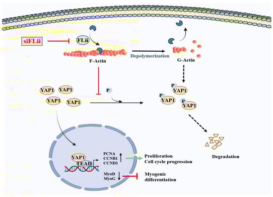 Then what is the underlying molecular mechanism responsible for myoblast proliferation and impaired differentiation by the depletion of FLII? In progenitor cells, cytoskeletal changes involving actin assembly, disassembly, and rearrangement play integral roles in the cell cycle, cell proliferation, and the activations of myogenic transcription factors [,]. Furthermore, actin remodeling critically regulates YAP1 in the Hippo signaling pathway through mechanotransduction []. YAP1 is a transcriptional coactivator that regulates the expression of target genes required for cell proliferation, tissue growth, and organ development []. MST1/2 and LATS1/2 kinases in the Hippo signaling pathway promote the phosphorylation of YAP1, which leads to proteasomal degradation of YAP1 and subsequent inhibition of YAP1 nuclear translocation []. It has been suggested that F-actin stress fiber can promote the nuclear translocation of YAP1 by regulating MST1/2 activity. F-actin-bound MST1/2 is inactive, while the decline of F-actin results in MST1/2 activation, which then phosphorylates LATS1/2 kinases, leading to the phosphorylation and degradation of YAP1 []. Furthermore, the recent discovery of Angiomotin (Amot) clarified the relationship between F-actin and the Hippo pathway. Amot contains a conserved binding domain capable of interacting with F-actin and YAP1 []. Interestingly, LATS-mediated Amot phosphorylation prevented Amot binding to F-actin but promoted its association with YAP1, which led to the retention of YAP1 in the cytoplasm and its subsequent degradation by proteasomes []. Thus, F-actin accumulation inhibits Hippo signaling and facilitates the nuclear translocation and activation of YAP1 as a consequence of the mechanotransduction mechanism []. In this regard, the knockdown of F-actin-capping/severing proteins, such as Gelsolin, Capz, and Cofilin, also led to the mechanotransduction-induced nuclear translocation of YAP1 and provoked cell proliferation [,]. In conclusion, as illustrated in Figure 6, we have revealed that siFLII dramatically increased F-actin levels by suppressing FLII expression, reducing YAP1 phosphorylation and facilitating the nuclear translocation of YAP1, which stimulates the expressions of YAP1 target genes involved in cell cycle progression and proliferation. Therefore, our study suggests that FLII plays a crucial role in myoblast proliferation and differentiation through the regulation of the F-actin/YAP1 axis in the Hippo signaling pathway.