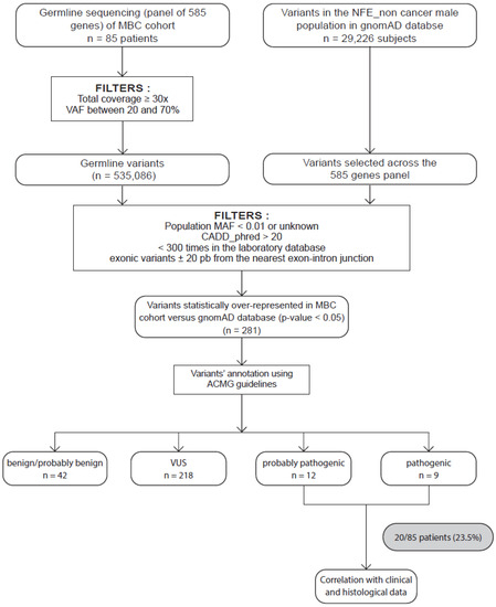 Strategy to identify candidate MBC susceptibility genes. Eighty-five patients with male breast cancer (MBC) were included. Germline variants of a panel of 585 genes were sequenced and aligned to the human genome hg19 before variant calling and annotation. All germline variants were identified and filtered as described in the Materials and Methods section. We obtained a total of 535086 variants. In parallel, we collected and applied the same filters on variants in the GnomAD database restricted to male noncancer NFE and selected across our 585-gene panel. Statistical tests were performed on 495 variants. We then selected the variants preferentially detected in our MBC population (adjusted p-value < 0.05), identifying 281 variants. These variants were then classified as PV, LPV, or variant of uncertain significance (VUS) and likely benign (LBV) or benign (BV) according to the ACMG criteria. We obtained 12 LPVs and 9 PVs. We also performed correlations with clinical and histological characteristics of patients.