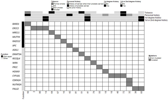 In total, 20 patients in our cohort carried at least one PV or LPV in 1 of the 585 genes screened, and 3 patients carried 2 variants (Table 2 and Figure 2). Among the three patients with two distinct PVs/LPVs, patient #32 was notable because his two variants mapped to two distinct genes: CDKN2A and NUTM2A. Two other MBC patients (patients #2 and #80) carried the same two PVs on the ERCC2 gene: c.1381C>G and c.2150C>G. The literature describes multiple individuals in whom these two ERCC2 variants occur in cis and as part of a complex allele of compound heterozygous genotypes with other pathogenic alleles and features of xeroderma pigmentosum (XPD; OMIM #278730) and trichothiodystrophy (TTD1; OMIM #601675) [25,26,27]. Our two MBC patients carrying these two ERCC2 variants did not present any of the characteristics of these diseases. Patient #2 only reported a case of a brain tumour in a paternal aunt diagnosed between 40 and 50 years of age, and patient #80 did not report a family history of cancer.