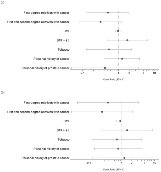 (a) Risk evaluation (ODD) of PV/LPV germline variants in MBC based on clinical characteristics. References of categorical values: first- or first- and second-degree relatives with cancer: presence of cancer; personal history of cancer: presence; smoking status = former and current. (b) Risk evaluation of PV/LPV germline DNA damage variants in MBC based on clinical characteristics. References of categorical values: first- or first- and second-degree relatives with cancer: presence of cancer; personal history of cancer: presence; smoking status = former and current.