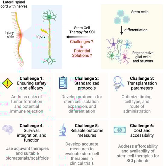 Despite the tremendous potential of stem cell therapy for SCI treatment, the field still faces significant challenges (Figure 2). Ensuring the safety and efficacy of stem cell-based therapies is paramount. For example, the risk of tumor formation and the potential for immune rejection must be carefully addressed [,]. Furthermore, the development of standardized protocols for stem cell isolation, expansion, and differentiation is crucial for the successful translation of stem cell therapies from the laboratory to the clinic. In addition to safety concerns, another major challenge is the optimization of stem cell transplantation parameters, such as the timing of transplantation, the choice of cell type, and the most effective route of administration [,]. Research has shown that the timing of transplantation can have a significant impact on the therapeutic outcome, as the injured spinal cord undergoes various stages of inflammation, secondary injury, and tissue repair [,]. Some studies suggest that transplantation is most effective when carried out 1–2 weeks after injury [], while others recommend a therapeutic window of 3–4 weeks following injury []. These timing considerations are crucial as the injured spinal cord undergoes various stages of inflammation, secondary injury, and tissue repair [,]. The choice of cell type is also a critical factor. For example, a study by Dai et al. (2013) confirmed that CT-guided stem cell transplantation is a safe and effective approach for treating sequelae of SCI, offering advantages such as minimal invasion and quicker recovery []. Identifying the optimal window for stem cell transplantation may be crucial for maximizing the benefits of stem cell therapy. The choice of cell type is also a critical factor in determining the success of stem cell therapy for SCI. As mentioned earlier, different stem cell types offer unique advantages and challenges [,]. Researchers need to determine which cell type or combination of cell types will provide the best therapeutic outcomes for SCI patients while minimizing the risks associated with each cell type.