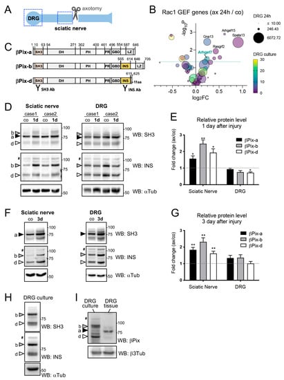 βPix expression increases in the proximal nerve stump after sciatic nerve transection. (A). Schematic illustration of peripheral nerve injury. For axotomy, the sciatic nerve was transected at the mid-thigh level. (B). RNA sequencing results showing the expression of 53 Rac1 guanine-nucleotide exchange factor (GEF) genes. The volcano scatter plot displaying expression fold change (log2FC) of each gene between control DRG and injured DRG (sciatic nerve axotomy, 24 h). The symbol size and color represent average gene counts in injured DRG and cultured DRG neurons, respectively. The dotted line corresponds to p = 0.05. (C). Schematic diagram of the protein domains of βPix isoforms, βPix-a, βPix-b, and βPix-d. INS region-containing isoforms, βPix-b and βPix-d, are expressed specifically in neurons. Anti-SH3 and anti-INS antibodies are used to detect all isoforms and the neuronal isoforms, respectively. The numbers denote amino acid positions. (D). βPix levels are examined by immunoblot analyses of the lysates from the sciatic nerve and DRG at day 1 after axotomy using anti-SH3 and anti-INS antibodies. α tubulin is used as a loading control. (E). Quantification of the results shown in (D). The βPix levels were normalized with the loading control and plotted as fold changes by injury in individual isoforms. In the sciatic nerve, expression of all βPix isoforms significantly increase at day 1 after the axotomy, with the highest fold induction of βPix-b. βPix levels in the DRG do not increase after injury, but show a decrease in βPix-d levels (27.7% decrease). (F). Immunoblot analyses of the lysates from the sciatic nerve and DRG at day 3 after axotomy using anti-SH3 and anti-INS antibodies. α tubulin is used as a loading control. (G). Quantification of the results shown in (F). βPix levels in the sciatic nerves are significantly increased at day 3 after injury, whereas βPix levels in the DRG are not significantly altered. (H). βPix-b and βPix-d protein levels in pure-neuronal embryonic DRG cultures. Immunoblotting with anti-SH3 antibody demonstrates that expression of the neuronal βPix isoforms, βPix-b and βPix-d, is dominant in the DRG neurons, whereas βPix-a isoform is rarely expressed. α tubulin is used as a loading control. (I). Lysates from pure-neuronal embryonic DRG cultures and mouse DRG tissues were analyzed for a side-by-side comparison. β3 tubulin is used as a loading control. DRG, dorsal root ganglion; ax, axotomized; co, control; SH3, Src homology 3 domain; DH, Dbl homology domain; PH, Pleckstrin homology domain; PR, proline-rich domain, GBD, Git1-binding domain; INS, insert region; LZ, leucine zipper domain. Black arrowhead, βPix-a; gray arrowhead, βPix-b; white arrowhead, βPix-d; #, βPix-bL isoform generated by an additional splicing event not described in (C) []. * p < 0.05, ** p < 0.01 by t test; mean ± standard error of the mean (SEM).