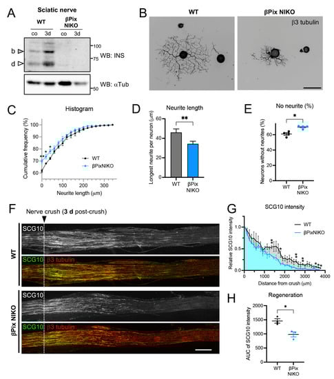 Based on the role of βPix as a GEF for Rac1 and CDC42 GTPases, we tested whether βPix is involved in axon regeneration after injury. We previously generated βPix neuronal isoform knockout (βPix NIKO) mouse line with the genetic removal of exon 19, which causes deletion of the corresponding INS region, leading to the βPix-b and βPix-d isoform-specific deficiency []. The βPix NIKO mice are viable, and their reported phenotypes include impairments in neuritogenesis and microtubule stability in cultured hippocampal neurons [], whereas conventional βPix knockout mice are embryonically lethal []. To test the requirement of the neuronal βPix isoforms for regeneration using βPix NIKO mice, we first confirmed the loss of the neuronal isoform expression in the sciatic nerves of βPix NIKO mice (Figure 3A). Adult DRG neurons cultured from the βPix NIKO mice displayed reduced neurite outgrowth (Figure 3B), as assessed by the cumulative distribution of the longest neurite length per neuron, mean neurite length, and percentage of outgrowth failure 16 h after plating (Figure 3C–E). The mean length of the neurites labelled by anti-β3 tubulin, a neuronal marker, was reduced in βPix NIKO cultures by 25.5%, compared to wild-type (WT) cultures. In vivo axon regeneration was also examined after crushing the mouse sciatic nerve with fine forceps, using a regeneration assay based on the regenerating axon-specific marker, SCG10 []. In the WT mice, SCG10-positive axons regenerated up to 0.5 mm on day 1 (Figure S1) and 3.5 mm on day 3 after the crush injury (Figure 3F,G), as reported previously []. The SCG10-positive axonal area, reflecting axonal regeneration, was not significantly different between WT and βPix NIKO on day 1 after crush injury (Figure S1C,D). However, consistent with the in vitro results, the SCG10-positive axonal area was significantly reduced in the βPix NIKO mice (32.8% decrease) three days after injury, when there was enough dynamic range of regenerated axon length (Figure 3F–H). Collectively, these data demonstrate that βPix neuronal isoforms positively regulate the regeneration of injured axons.