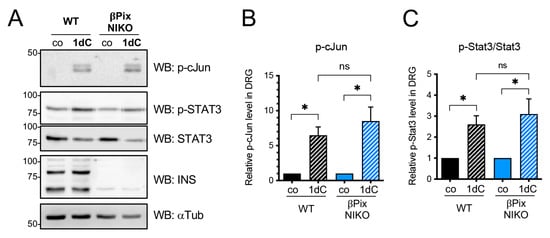 Peripheral axon regeneration is regulated by two distinct mechanisms: conditioning injury effects involving transcriptional regulation by injury and local control of axon extension from the site of injury []. Although the two pathways can interact via axon transport of regenerative signals, it is likely that βPix primarily contributes to local axonal growth, considering its GEF activity and axonal localization. To understand the molecular role of βPix for regeneration, we tested if βPix is involved in induction of the conditioning injury effect that is represented by phosphorylation of injury-associated transcription factors, such as cJun and STAT3 [,,], using βPix NIKO mice. We assessed the transcription factor activation 24 h after the nerve crush to minimize potential communication with signals from regrowing axons at a later stage. In the WT mice, nerve crush injury largely induced the phosphorylation of both cJun and STAT3 (Figure 4A). We found that this induction was not significantly altered in the absence of neuronal βPix isoforms (Figure 4B,C). These data support the notion that βPix neuronal isoforms are dispensable for the conditioning injury effect, but they may mainly regulate the extension of injured axons.