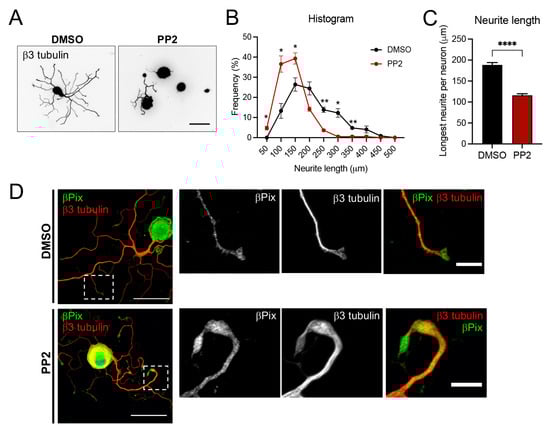 The successful phosphorylation of cJun and STAT3 in βPix NIKO (Figure 4) suggests that βPix may promote axonal extension via its previously identified function as a GEF that regulates cytoskeletal dynamics through small GTPases. The INS region, unique to neuronal isoforms, contains an Src phosphorylation site (Tyr598 in βPix-b), and we have reported that this phosphorylation promotes Rac1 GEF activity and normal dendritic spine development []. To test whether the same pathway is involved in axonal regeneration, we confirmed that phosphorylated Src (Tyr418) was expressed in sciatic nerves, though the levels were not markedly increased by injury (Figure S2). Next, we examined whether axonal regrowth in adult DRG neuronal cultures was impaired by Src inhibition. We treated cultures with a Src kinase inhibitor, PP2 (10 μM), 5 h after plating to rule out its effects on initial cell adhesion and sprouting, and instead focused on possible changes in axon extension []. For the same reason, we also grew cultures for 20 h, which was longer than the previous βPix NIKO analysis (Figure 3B). We measured only neurons with neurites to exclude cells that failed to initiate neurites. We stained the cultures for β3 tubulin and measured the longest neurite length per neuron (Figure 5A). Overall, axonal outgrowth was decreased by PP2 treatment, as shown by the higher frequencies of neurons in the short neurite length range in PP2-treated neurons compared to vehicle-treated control neurons (DMSO) (Figure 5B). The mean neurite length in PP2-treated neurons was also significantly decreased compared to the control (38.4% decrease) (Figure 5C). Additionally, we found aberrant growth cones in the PP2-treated neurons, where growth cone morphology and βPix localization were impaired (Figure 5D). In DMSO-treated control cultures, βPix was found in the lamellipodia of fan-shaped growth cones. In the PP2-treated neurons, the growth cones often appear disorganized, and in these cases, βPix localization was mostly restricted to the tubulin-positive area of the growth cones rather than observed in lamellipodia. These results support the requirement of Src activity for the adequate localization of βPix in regenerating growth cones.