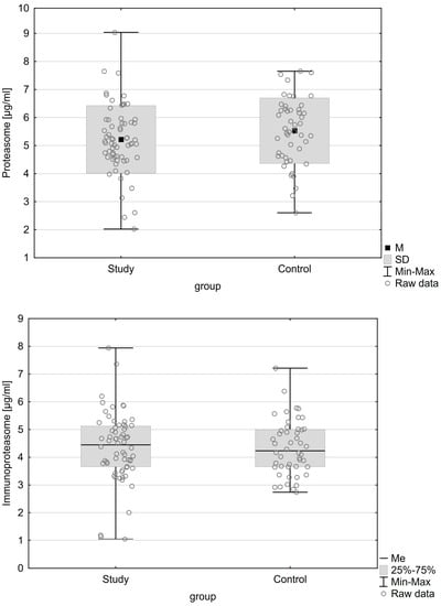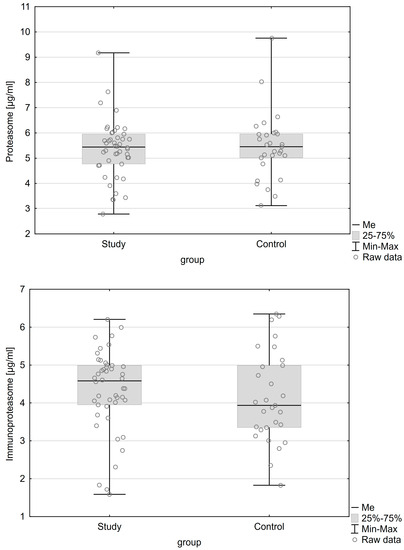 | Immunoproteasome concentration Me (IQR) | 4.583 (1.04) µg/mL | 3.936 (1.638) µg/mL | 0.284 |
