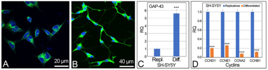 Neuronal differentiation of the SH-SY5Y cells. (A) replicative and (B) retinoic acid differentiated cells with α-tubulin immunolocalization (green signals). Cell nuclei were stained with DAPI (blue). (C) Expression level of the neuronal differentiation marker GAP-43 by qRT-PCR. (D) Expression level of cyclins CCND1, CCNE1, CCNA2, CCNB1 in SH-SY5Y replicative and differentiated cells by qRT-PCR. Scale bars: (A) 20 μm; (B) 40 μm. RQ: relative quantitation. *** statistical significance, obtained by two tails t-test: p < 0.001.