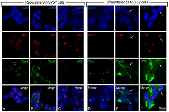 Moreover, we used the anti-Tau-5 antibody (detecting phosphorylated and unphosphorylated total tau) as a tau control, and anti-Ki-67 (specific marker located in the nucleus of replicative cells) as a control of the replicative status of the cells. The indirect immunofluorescence (IIF) detection of the nuclear antigen Ki-67 highlighted the active cell cycle in the replicative SH-SY5Y cells, and its absence in the retinoic acid-induced cells indicated the differentiated status of these cells (Figure 2). In some cases (namely in the cells where Ki-67 is absent), the upstream binding transcription factor (UBTF) (instead of Ki-67) was detected by IIF to highlight the nucleolus of the differentiated cells. Concerning Ki-67, we detected, in the differentiated cell samples, a small percentage of positive cells (1.3 ± 0.29, mean ± S.E.M.), possibly corresponding to those cells that did not react to retinoic acid treatment (Figure 2E shows one of these cases).