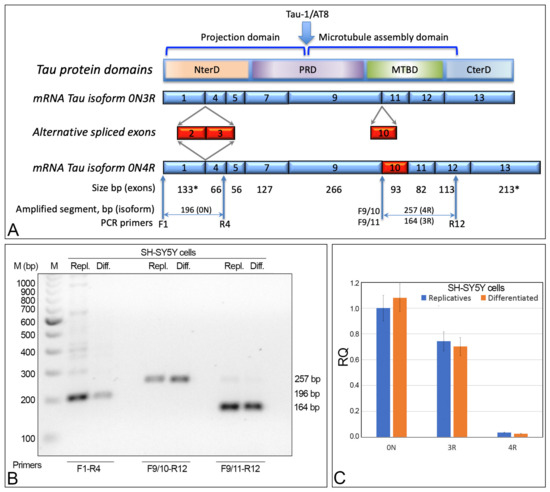 To identify the tau isoforms in the replicative and differentiated SH-SY5Y cells, alternative splicing of the MAPT gene was analyzed by RT-PCR using specific primers (Figure 3A). F1-R4 primers amplify the sequence between exon 1 and exon 4, and are useful to show the presence/absence of exon 2 and/or 3 (0N, 1N, or 2N isoforms). These primers allowed for the detection, in both replicative and differentiated SH-SY5Y cells, of a DNA segment of 196 bp, matching the 0N isoform. Moreover, 4R (exon 10 present) and 3R (exon 10 absent) isoforms were detected with F9/10-R12 and F9/11-R12 primers, respectively. Both amplifications yielded the expected fragments, indicating that, in replicative or differentiated SH-SY5Y cells, the two mRNAs related to 3R and 4R isoforms are present (those without and with exon 10, respectively) (Figure 3).