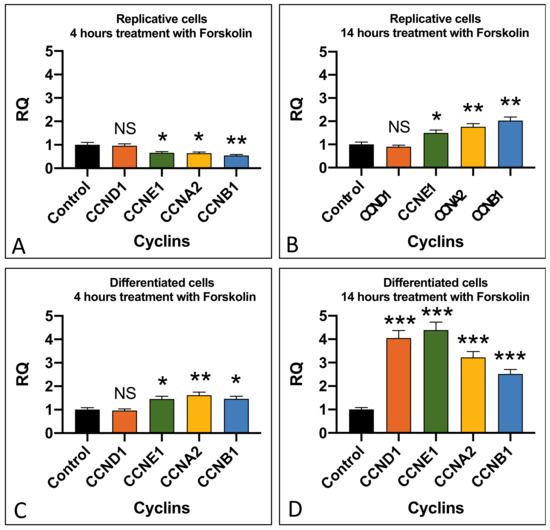 In the replicative cells, we detected a significant increase in the expression of cyclins CCNE1 (p < 0.05), CCNA2 (p < 0.01), and CCNB1 (p < 0.01) after 14 h of cell exposure to forskolin (Figure 4D). In differentiated cells, an increase in the cyclin expression was detected after just 4 h of treatment and it became very high after 14 h of exposure to forskolin, with cyclin CCND1 (p < 0.001) and CCNE1 (p < 0.001) showing the highest levels of expression compared to the untreated cells (Figure 4A–D).