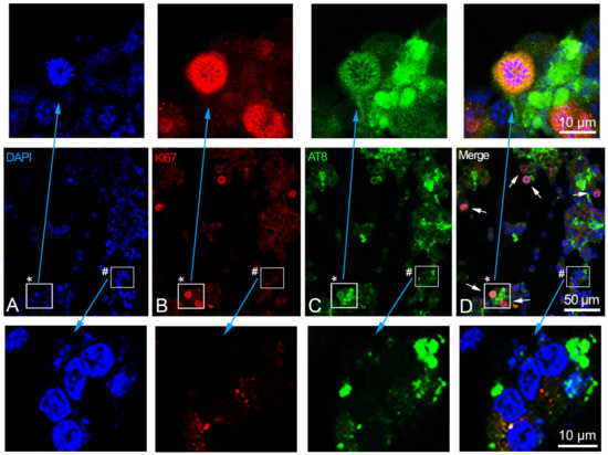 Cell counting for statistical analyses was performed as previously described [17,20]. In detail, cells with IIF were counted on 0.5-µm scanned images obtained with CLSM. Three experiments per group were analyzed. The number and percentage of AT8- or Ki67-positive cells and the number of cells at the mitotic stage were obtained in three optical fields, at 400× magnification, for each experiment.