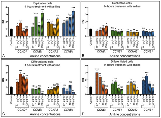 Aniline is an aromatic amine, widely used in industrial manufacturing, that induces oxidative stress in cells. Replicative SH-SY5Y cells increased expression of cyclins CCND1, CCNE1, CCNA2, and CCNB1 after few hours of treatment with aniline, and generally in a dose-dependent way (Figure 6A). After 14 h, cyclins returned to levels comparable to the untreated controls (Figure 6B). The aniline treatment of the retinoic acid differentiated SH-SY5Y cells showed, after 4 h, an increased expression level of CCND1 cyclin (statistical significance p < 0.001), with an expression at about twice the level of the initial value being observed (Figure 6C). At 14 h, also, the other cyclins statistically increased the expression level, especially the cyclin CCNB1 (p < 0.001) (Figure 6D).