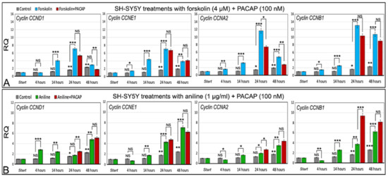 Expression analysis of cyclins in differentiated SH-SY5Y cells treated with forskolin or aniline supplemented with PACAP. (A) Forskolin and forskolin/PACAP treatments. (B) Aniline and aniline/PACAP treatments. Control: differentiated untreated cells at 0 (start), 4, 14, 24, and 48 h. RQ: relative quantitation obtained by qRT-PCR. Statistical significance was evaluated by two-tail t-test. Controls at the various times were compared with respect to the differentiated untreated cells (start). Forskolin or aniline treatments at the various times were compared with the corresponding control at the same treatment time. Forskolin/PACAP or aniline/PACAP treatments at the various times were compared with the corresponding forskolin or aniline treatments, respectively, at the same time. * p < 0.05, ** p < 0.01, and *** p < 0.001. NS: statistically not significant.
