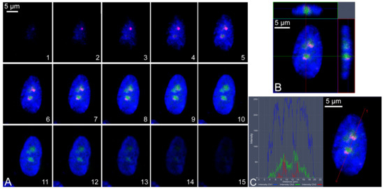 Example of co-localization of IIF signals in the cell nucleus. (A) serial section along the z-axis of a cell showing detection of tau (green signals) and ki-67 (red signals). Each image (from 1 to 15) corresponds to a serial section of 0.3 µm thickness. (B) Orthogonal view of the same cell shown in (A). In the upper part is presented a view of cell section along the green horizontal line. In the right part is presented a view of the cell section along the red vertical line. (C) The same cell is shown in (A) with the fluorescence intensity (graph on the left) of the tau (green), Ki-67 (red), and DAPI (blue) along the red line indicated by the number 1. The images show the localization in the same nuclear compartment of the analyzed epitopes. Scale bars (5 µm) were indicated for each panel (A–C). Images were produced with the ZEN-2010 software.