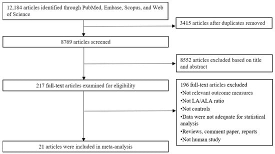 A total of 12,184 publications were initially searched from four databases, and 8769 articles were retained after eliminating duplicates. Subsequently, 217 articles were selected for full-text examination based on the titles and abstracts. Ultimately, 21 articles were included in this meta-analysis [,,,,,,,,,,,,,,,,,,,,]. The screening process is depicted in Figure 1. Among the 21 articles that met the eligibility criteria, the effects of LA/ALA ratio on FBS were investigated in all 21 studies. Insulin was assessed in 17 studies, HOMA-IR in 10 studies, and HbA1c in 7 studies.