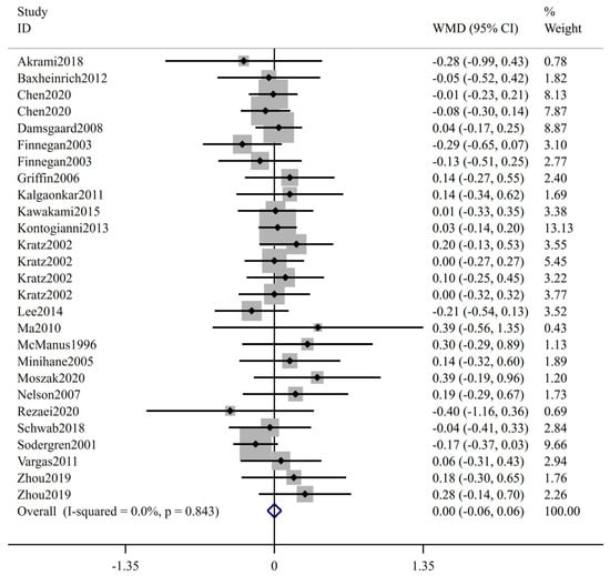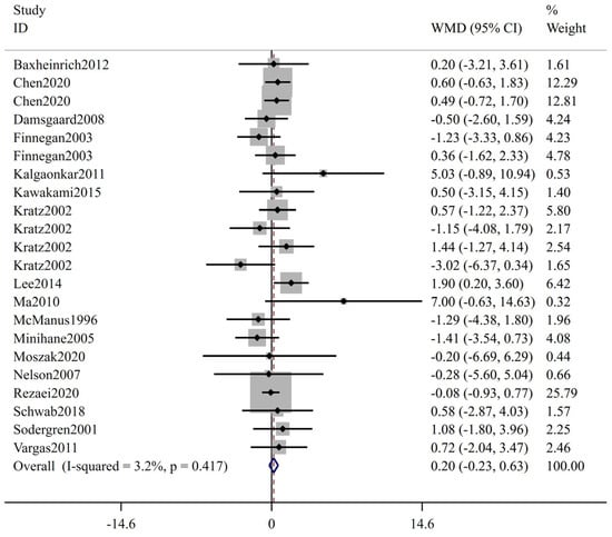 Endnote software (Endnote X9.1) was employed to process the article, eliminating any duplicate entries. Subsequently, the screening and full text review were conducted using Microsoft Excel software (Microsoft Excel 16.0). To conduct the primary analysis, sensitivity analyses, and assess publication bias, we utilized STATA software (version 14.0, Stata Corp., College Station, TX, USA). Mean (SD) were extracted to perform a combined effect size analysis. Conversion formulas were utilized to calculate SD in situations where they were not directly provided []. If the standard deviation (SD) of the change was not provided in the trials, it was calculated using the formula: SD change = square root [(SD pre-treatment)2 + (SD post-treatment)2 − (2R × SD pre-treatment × SD post-treatment)] (R = 0.5). Moreover, when data were solely presented graphically, the relevant information was digitally extracted and quantified using the GetData Graph Digitizer software (GetData 2.25). The statistical significance of net changes was assessed using the weighted mean difference (WMD) with a 95% confidence interval (CI). The level of heterogeneity was classified as low (I2 ≤ 50%) or high (50% < I2), accordingly. Sensitivity analysis was conducted to investigate potential sources of heterogeneity, where each study was individually excluded to assess the impact of any specific study on the overall validity of the effect size. We utilized Begg’s tests, Egger regression tests, and visual calculations using funnel plots to evaluate possible publication bias. Furthermore, predetermined subgroup analyses were conducted to examine association between different subgroups and glucose. A p value below 0.05 was used to assess the statistical significance.