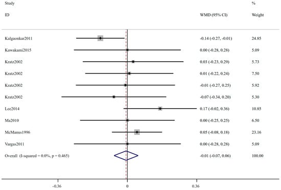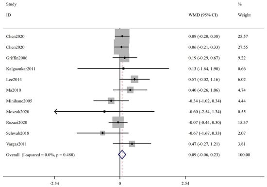 The forest plot of FBS is shown in Figure 2; 27 trials including 1415 participants (cases = 714, controls = 701) reported FBS as an outcome measure. According to the overall analysis from the fixed-effects models, the low-ratio LA/ALA diet did not lead to significant change on FBS (WMD: 0.00 mmol/L, 95% CI: −0.06, 0.06, p = 0.989). The I2 test indicated no statistically significant heterogeneity among the included studies (I2 = 0.0%, p = 0.843). Figure 3 displays the results for insulin, involving 22 trials with a total of 1096 participants (549 cases and 547 controls). Based on the pooled results from fixed-effects models, there was no significant change in insulin level following interventions with low-ratio LA/ALA diet (WMD: 0.20 μIU/mL, 95% CI: −0.23, 0.63, p = 0.360). The included trials exhibited non-significant heterogeneity (I2 = 3.2%, p = 0.417). Figure 4 illustrates the effect of low-ratio LA/ALA diet on HOMA-IR, involving eleven trials with a total of 736 participants (373 cases and 363 controls). The pooled findings indicated no significant decrease in HOMA-IR after consuming low-ratio LA/ALA diet (WMD: 0.09, 95% CI: −0.06, 0.23, p = 0.243). Heterogeneity was not significant, as indicated by the I2 value (I2 = 0.0%, p = 0.480). The forest plot of HbA1c is shown in Figure 5, 11 trails including 257 participants (cases = 129, controls = 128) examined the impact of low-ratio LA/ALA diet on the HbA1c. Our findings show no significant reduction in HbA1c levels after the low-ratio LA/ALA dietary intervention (WMD: −0.01%, 95% CI: −0.07, 0.06, p = 0.836). Additionally, no substantial heterogeneity among the included trials was observed (I2 = 0.0%, p = 0.465).